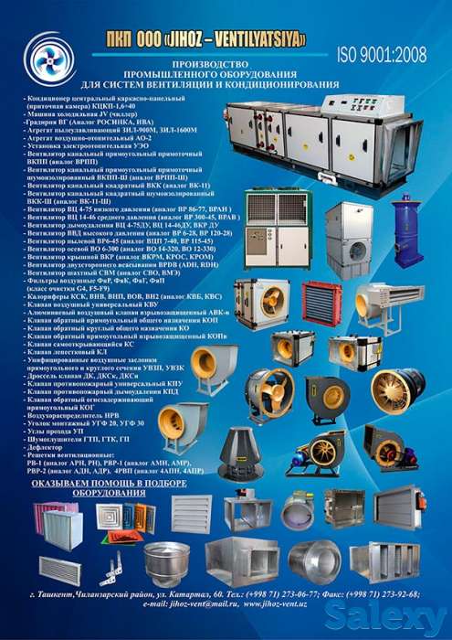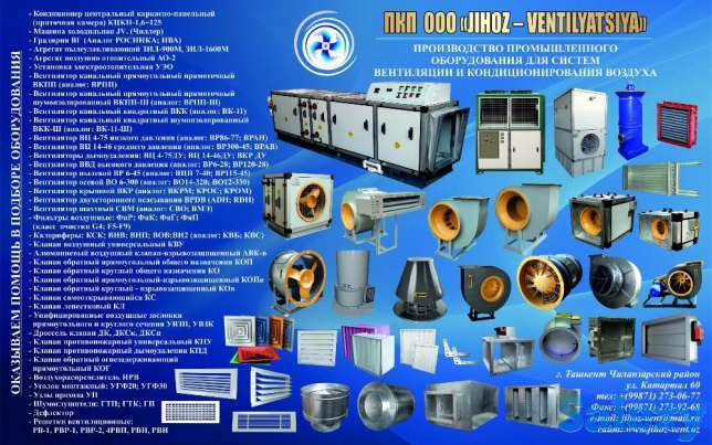 Кондиционеры и вентиляторы есть не только у заграничных производителей. Производственное коммерческое предприятие «Жихоз-вентиляция» создано в 2002 году на базе предприятия по ремонту вентиляционного оборудования и кондиционирования воздуха. За период работы на рынке Узбекистана предприятием одним из первых в республике было освоено производство отечественного оборудования. Наше предприятие решает задачи в различных отраслях производства и услуг, включая горнодобывающие предприятия, нефтегазовую, фармацевтическую, текстильную, пищевую, аграрную, строительную промышленности и т.д. Для выпуска современного оборудования нами было приобретено всё необходимое оборудование для выпуска и изготовления любых заказов наших клиентов. Благодаря большому практическому опыту технико-конструкторского отдела, который укомплектован высокопрофессиональными инженерами, нам по плечу решать любые технические вопросы. Высокая квалификация специалистов с большим опытом работы является залогом долговечной и эффективной работы.